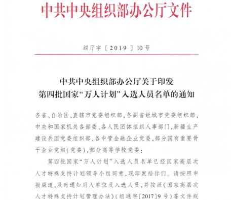 2月3日,中共中央组织部办公厅下发《关于印发第四批国家“万人计划”入选人员名单的通知》(组厅字[2019]10号),公司余贵珍、杨世春两位教授入选第四批国家“万人计划”科技创新领军人才。截至目前,公司共计4位教师入选国家“万人计划”。