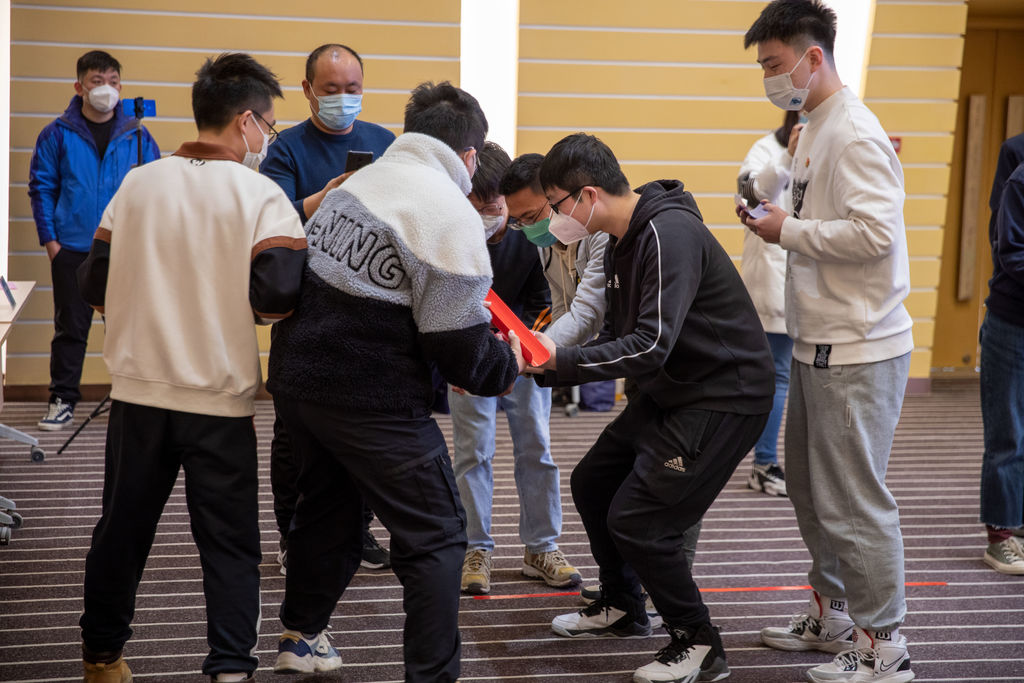 在互动游戏环节——节水接力赛中,8所高校分成两组,各派出10名员工进行节水接力赛,所有队员在场地“55”面对面排开,每个队员手拿一根半圆形的球槽,将“水滴”(圆球)连续传动(滚动)到下一个队员的球槽中,并迅速地排到队伍的末端,继续传送前方队员传来的球,直到球安全的到达指定的目的地为止。在最短时间内完成“水滴”运输任务的队伍获胜。通过同学们一起协作游戏,不让“水滴”掉落,传递节水需要大众一起努力的理念。